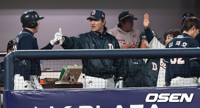 15일 오후 수원kt위즈파크에서 열린 '2015 타이어뱅크 KBO 리그' kt 위즈와 두산 베어스의 경기 12회초 1사 만루 김현수가 희생플라이를 치고 덕아웃에서 동료들과 하이파이브를 하고 있다. 3루주자 김재호 득점.