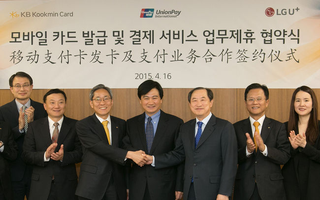 LG유플러스(부회장 이상철), 차이나유니온페이 및 유니온페이 인터내셔널(동사장 거화용, GeHuaYong), KB금융그룹(회장 윤종규), KB국민카드(사장 김덕수)는 16일 LG유플러스 용산 신사옥에서 '모바일 카드 발급 및 결제 서비스 업무 제휴 협약식'을 갖고 유니온페이 모바일 카드 발급 및 결제 서비스를 공동 추진키로 했다.