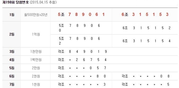 지난 15일 나눔로또는 연금복권520의 198회차 1등 당첨번호가 '5조789061번'과 '6조315153'으로 결정됐다고 밝혔다.