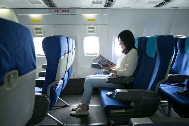 에어부산의 좌석은 좌석 간 간격이 타 저비용항공사 대비 2~3인치 넓게 배치되어 있다. 아래는 에어부산의 특화서비스인 블루뷰티 서비스를 어린이 승객에게 시현하고 있다. 에어부산 홈페이지를 통해 원하는 좌석을 무료로 자유롭게 선택할 수 있다. / 에어부산 제공