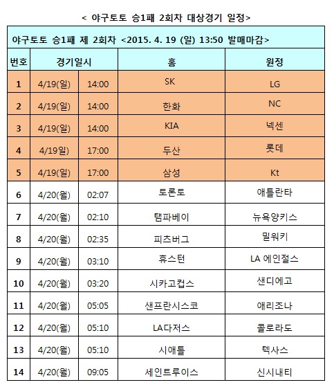 [야구토토] 국민체육진흥공단(www.kspo.or.kr)이 발행하는 체육진흥투표권 수탁사업자인 스포츠토토(www.sportstoto.co.kr)는 오는 19일부터 20일까지 벌어지는 국내 프로야구(KBO) 5경기 및 미국프로야구(MLB) 9경기 등 총 14경기를 대상으로 한 야구토토 승1패 2회차 게임을 발행한다고 밝혔다.