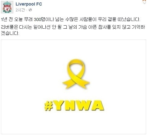 그리고 리버풀도 "1년 전 오늘 무려 300명이나 넘는 수많은 사람들이 우리 곁을 떠났습니다. 리버풀은 다시는 일어나선 안 될 그 날의 가슴 아픈 참사를 잊지 않고 기억하겠습니다"란 글과 노란리본 게재해 눈길을 끌었다.