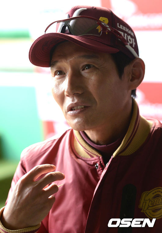 16일 오후 인천 SK행복드림파크에서 열리는 '2015 타이어뱅크 KBO리그' SK 와이번스와 넥센 히어로즈의 경기에 앞서 넥센 염경엽 감독이 세월호 참사 1주기를 추모하는 뜻에서 노란리본을 부착한 모자를 착용하고 취재진과 이야기를 나누고 있다.