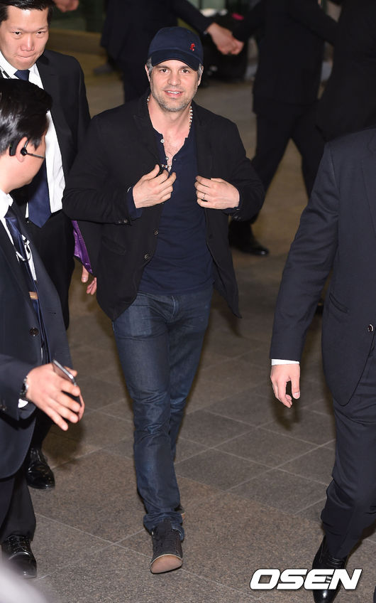 영화 '어벤져스2'의 조스 웨던 감독과 마크 러팔로, 크리스 에반스가 16일 오후 인천국제공항을 통해서 입국했다.