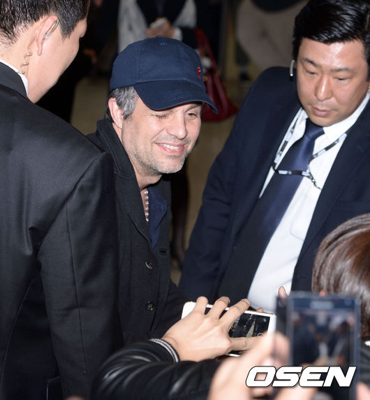 영화 '어벤져스2'의 조스 웨던 감독과 마크 러팔로, 크리스 에반스가 16일 오후 인천국제공항을 통해서 입국했다.