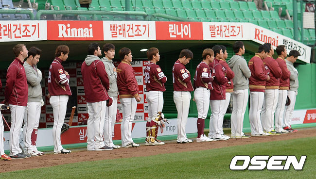 경기에 앞서 넥센 선수단이 세월호 1주기를 추모하기 위해 묵념을 하고 있다.