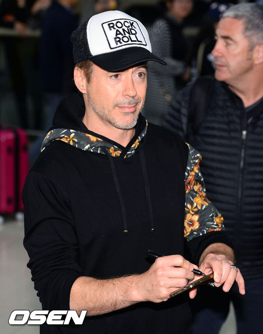 로버트 다우니 주니어가 입국장을 빠져나오며 팬의 요청에 사인을 하고 있다.