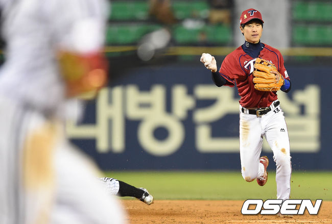 16일 오후 서울 잠실구장에서 열린 '2015 타이어뱅크 KBO 리그' LG 트윈스와 KIA 타이거즈의 경기 4회말 1사 1루 오지환의 2루수 앞 땅볼에 강한울이 2루에서 1루주자 손주인을 포스아웃 시키고 1루로 마저 송구를 못 하고 있다.