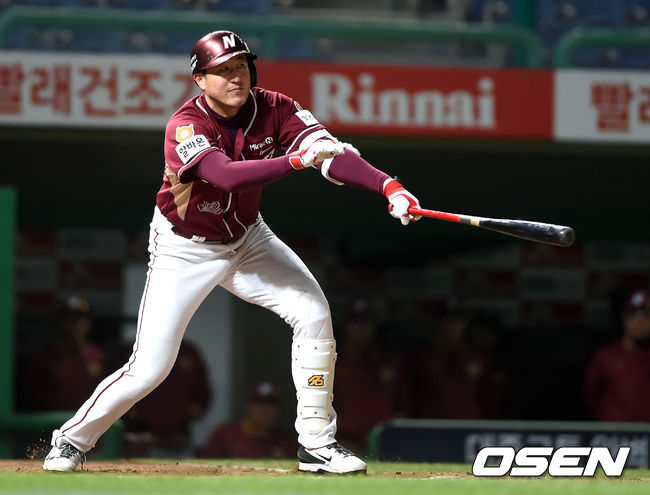 8회초 무사 넥센 유한준이 SK 박종훈을 상대로 팀 첫 안타를 뽑아내고 있다.