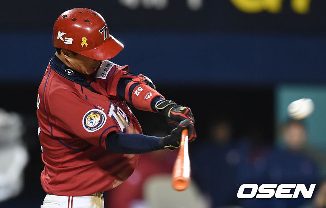 16일 오후 서울 잠실구장에서 열린 '2015 타이어뱅크 KBO 리그' LG 트윈스와 KIA 타이거즈의 경기 6회초 1사 2루 최용규가 1타점 2루타를 치고 있다.
