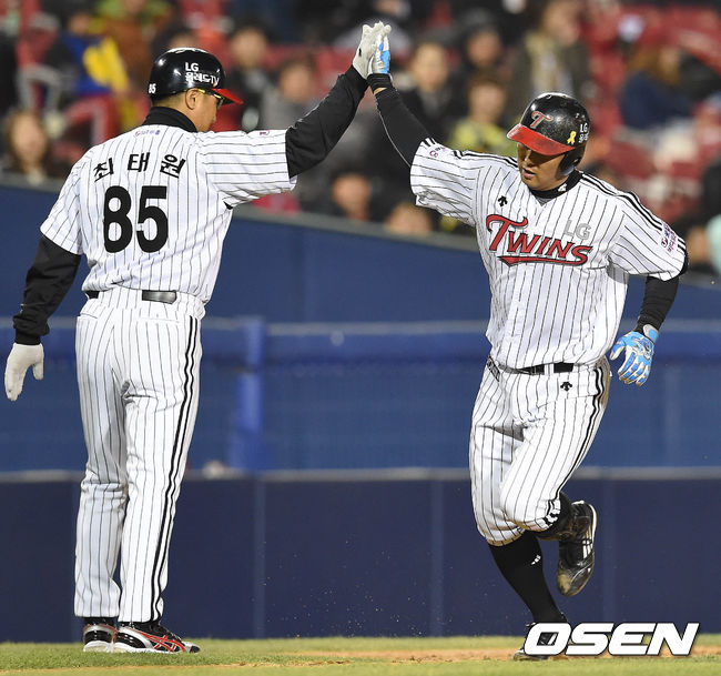 16일 오후 서울 잠실구장에서 열린 '2015 타이어뱅크 KBO 리그' LG 트윈스와 KIA 타이거즈의 경기 7회말 선두타자 최경철이 솔로홈런을 치고 최태원 코치와 하이파이브를 하고 있다.
