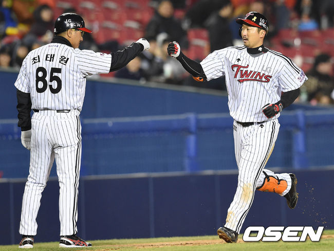 16일 오후 서울 잠실구장에서 열린 '2015 타이어뱅크 KBO 리그' LG 트윈스와 KIA 타이거즈의 경기 7회말 1사 1,2루 이병규가 스리런홈런을 치고 최태원 코치와 하이파이브를 하고 있다.