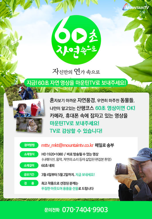 산 전문 채널 ‘마운틴TV’가 시청자들이 직접 찍은 산행·여행 중 찍은 영상 혹은 자연에서 우연히 만난 야생동물 등 직접 찍은 자연영상을 제보 받아 TV로 방영한다.