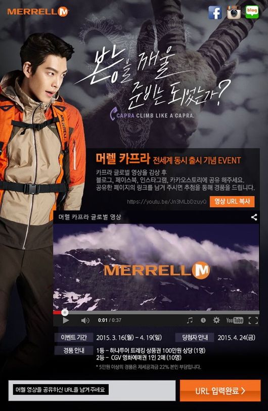 머렐은 오는 19일까지 '카프라 신고 트레킹 여행가자- 머렐 카프라 전세계 동시 출시 기념 이벤트' 진행한다. 이번 이벤트는 누구나 참여 가능하며 머렐 카프라 글로벌 영상을 본 후, 영상 URL을 블로그, 페이스북, 인스타그램, 카카오스토리에 공유하면 된다. 머렐 공식 홈페이지 내 이벤트 페이지(https://www.merrellkorea.co.kr/01_story/event_view.asp?EventsNo=112)에 공유한 SNS 페이지의 링크를 남기면 된다. 추첨을 통해 당첨된 1등(1명)에게는 100만 원 상당의 하나투어 트레킹 상품권을, 2등(총 10명)에게는 CGV 영화예매권(1인 2매씩)를 제공할 예정이다. 당첨자는 24일 머렐 홈페이지를 통해 공지된다.