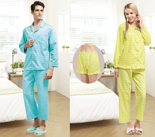 이번에 선보인 커플 잠옷 세트의 색상은 상쾌한 느낌의 민트(남성용)와 파스텔톤의 옐로우 컬러(여성용) 2가지로 봄 날씨의 화사함과 포근함을 느낄 수 있다. 여기에 심플하고 귀여운 꽃 모양 나염 패턴을 적용해 아기자기함을 자아냈으며 네크라인 및 가슴포켓 부분의 체크무늬 포인트와 리본 디테일로 캐주얼함을 더했다. 여성용 상의 하단 끝부분에는 레이스를 달아 귀여움을 한 층 살린 것이 특징이다.