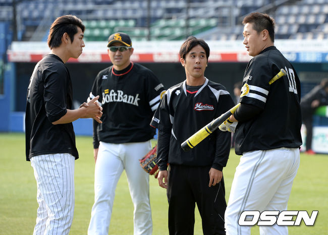 17일 오후 일본 지바현 QVC 마린필드에서 열릴 2015 일본프로야구 지바롯데와 소프트뱅크 호크스의 경기에 앞서 지바롯데 이대은과 소프트뱅크 이대호가 인사를 나누고 있다.