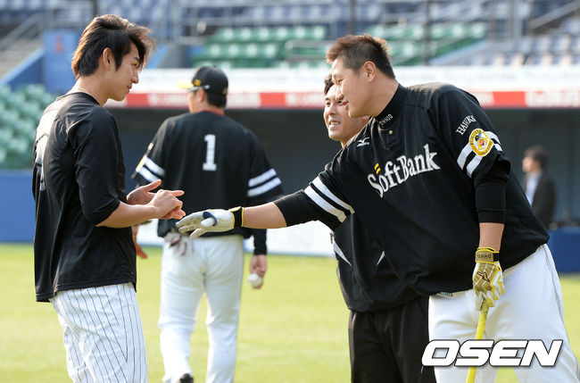 17일 오후 일본 지바현 QVC 마린필드에서 열릴 2015 일본프로야구 지바롯데와 소프트뱅크 호크스의 경기에 앞서 지바롯데 이대은과 소프트뱅크 이대호가 인사를 나누고 있다.