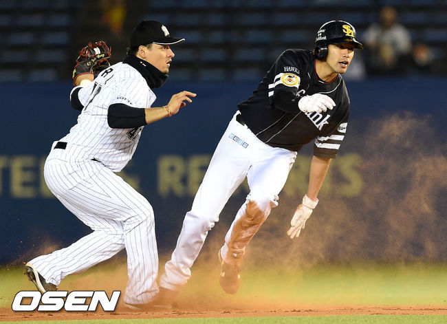 1회초 2사 1루에서 소프트뱅크 우치카와 타석때 1루주자 야나기타가 도루에 실패하고 있다.