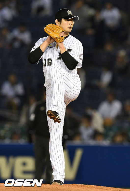 1회초 무사에서 지바롯데 선발투수 와쿠이가 힘차게 공을 던지고 있다.