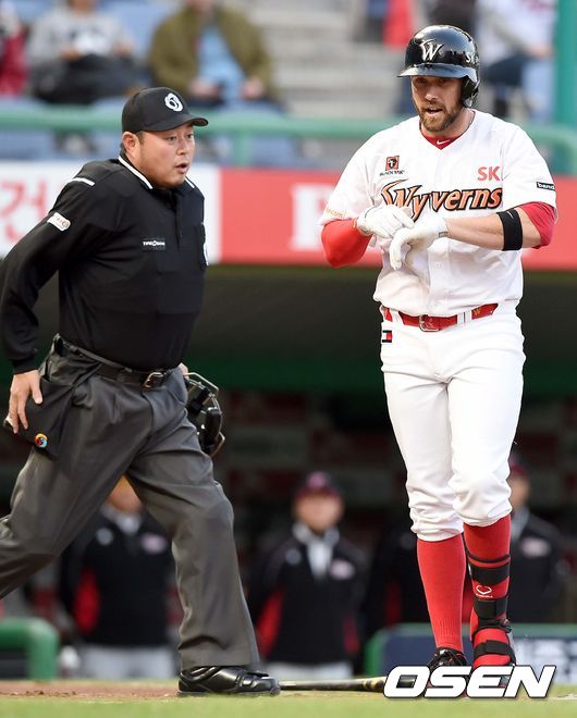1회말 SK 공격 2사 1루 상황 브라운이 LG 선발 루카스의 공에 손등을 스친 뒤 이영재 주심에게 상황을 설명하며 1루로 향하고 있다.