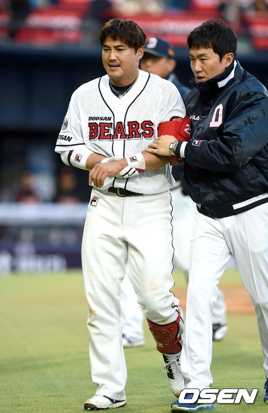 1회말 1사 1,3루 두산 홍성흔이 롯데 송승준의 공에 손가락에 맞아 교체되고 있다.