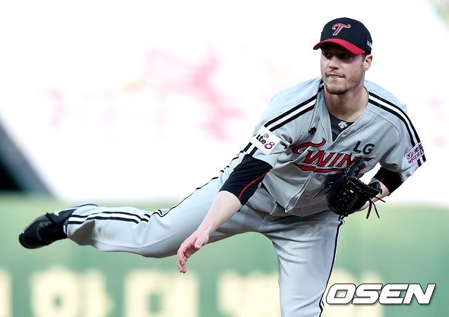 LG 선발 루카스가 힘차게 공을 뿌리고 있다.