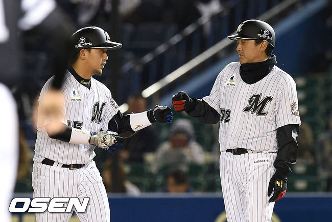 2회말 무사 1,3루에서 지바롯데 타무라가 우전 적시타를 치고 하이파이브를 하고 있다.