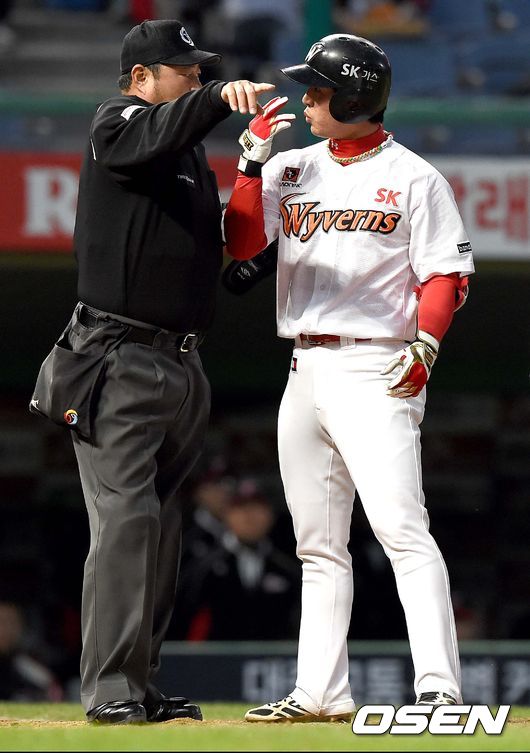 3회말 SK 공격 선두타자로 나선 김성현이 LG 선발 루카스의 공에 몸쪽 높은 공에 팔꿈치를 맞은 뒤 이영재 심판에게 상황을 설명하며 1루로 향하고 있다.
