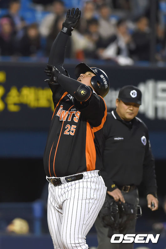 2회초 무사 롯데 최준석이 솔로 홈런을 때린 뒤 세레머니를 하고 있다.