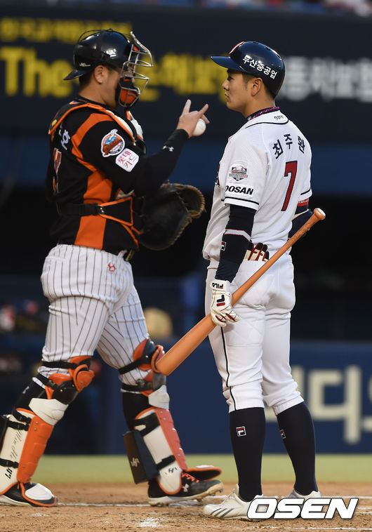 1회말 1사 만루 두산 최주환이 삼진을 당한 뒤 구심을 바라보고 있다.