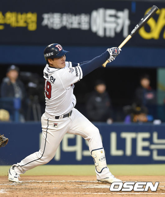 1회말 2사 만루 두산 민병헌이 적시타를 때리고 있다.