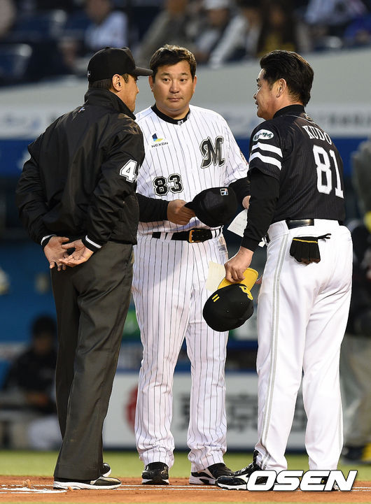 경기에 앞서 지바롯데 이토 감독이 소프트뱅크 구도 감독과 인사를 나누고 있다.