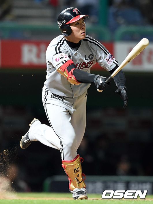 5회초 LG 공격 2사 주자없는 상황 오지환이 우월 솔로포를 날리고 배트를 든 채 그라운드를 달리고 있다.