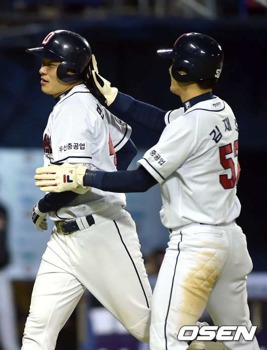 2회말 2사 2,3루 두산 민병헌이 스리런 홈런을 때린 뒤 김재호에게 축하받고 있다.