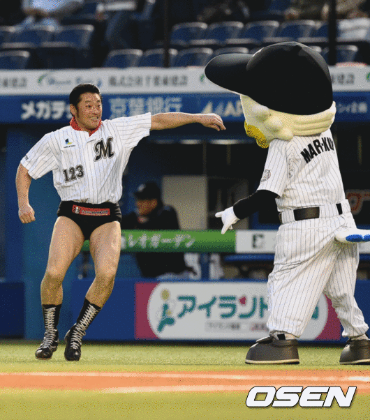 경기에 앞서 일본의 코미디언 안토키노 이노키가 지바롯데 마스코트와 코믹 퍼포먼스를 펼치고 있다.