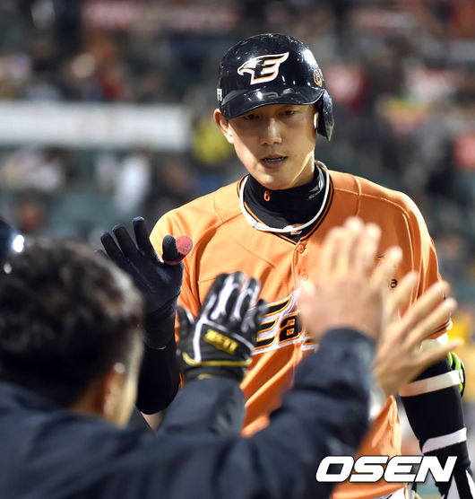 17일 대전 한화생명이글스파크에서 열린 2015 타이어뱅크 KBO리그 한화 이글스와 NC 다이노스의 경기 6회말 1사 김회성이 솔로 홈런을 치고 동료들의 환영을 받고 있다.