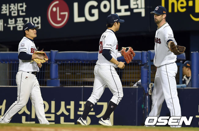 두산 니퍼트가 6회초 수비를 마치고 야수들과 하이파이브를 하고 있다.