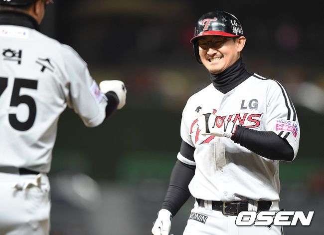 7회초 LG 공격 2사 1, 2루 상황 박용택이 적시 1타점 좌중간 안타를 날리고 1루에 안착해 한혁수 코치와 인사를 나누고 있다.