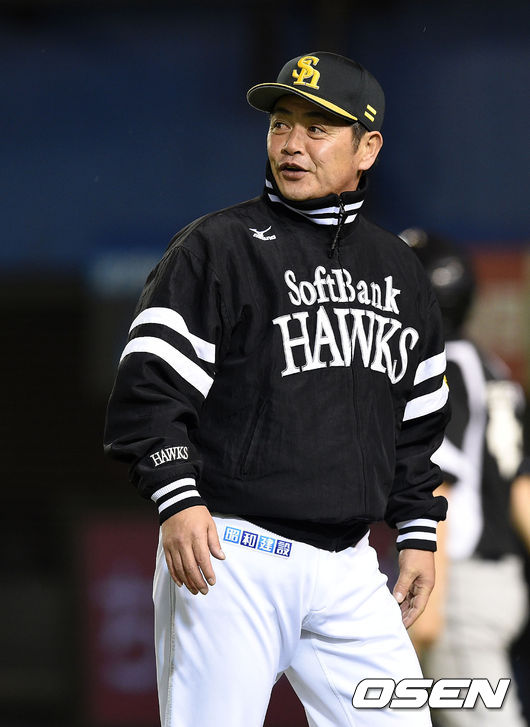 7회말 2사 2루에서 소프트뱅크 구도 감독이 투수교체를 지시하고 더그아웃으로 가고 있다.