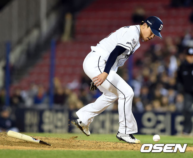 7회초 1사 1루 두산 오현택이 롯데 김문호의 타구를 처리하고 있다.