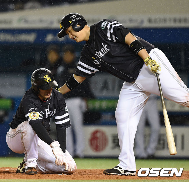 8회초 2사 1,3루 소프트뱅크 이대호가 볼이 빠진 틈에 홈쇄도를 했지만 실패한 3루주자 야나기타를 위로하고 있다.