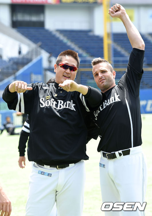 18일 오후 일본 지바현 QVC 마린필드에서 열릴 2015 일본프로야구 지바롯데와 소프트뱅크 호크스의 경기에 앞서 소프트뱅크 이대호가 사파테와 취재진을 보며 포즈를 취하고 있다.