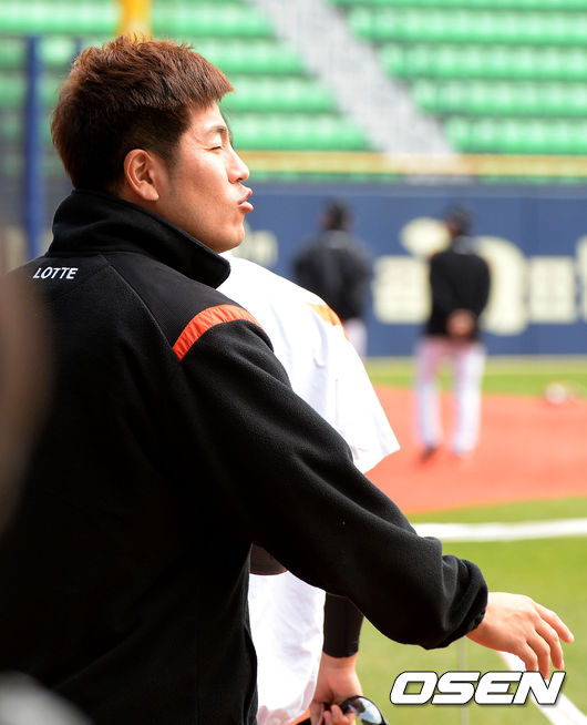 경기에 앞서 롯데 강민호가 그라운드에 들어서며 두산 김재호에 뽀뽀하는 시늉을 하며 인사를 하며 있다.