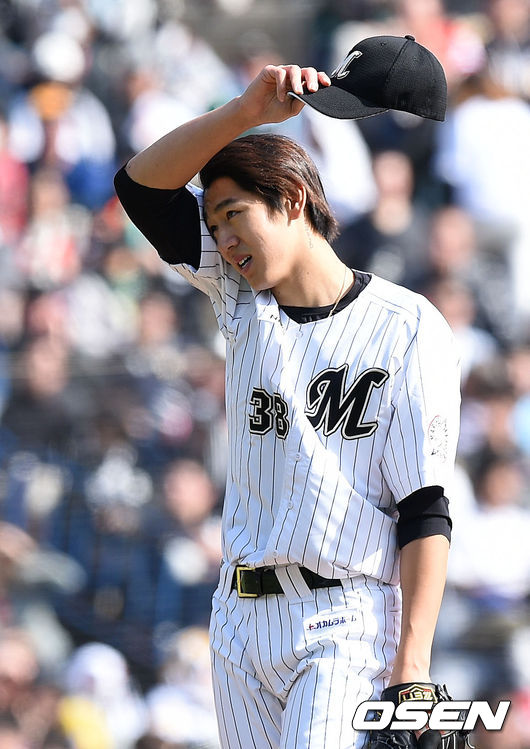 4회초 1사에서 소프트뱅크 마쓰다에게 안타를 허용한 지바롯데 이대은이 아쉬운 표정을 짓고 있다.