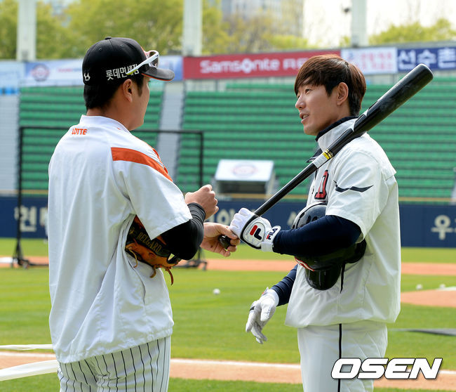 경기에 앞서 두산 김재호와 롯데 문규현이 이야기를 나누고 있다.
