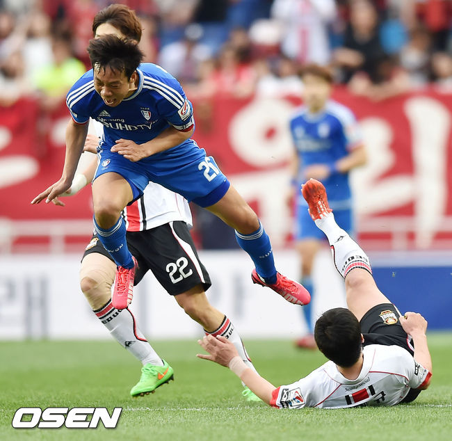 후반 수원 염기훈을 향해 서울 김진규가 위험한 태클을 하고 있다.