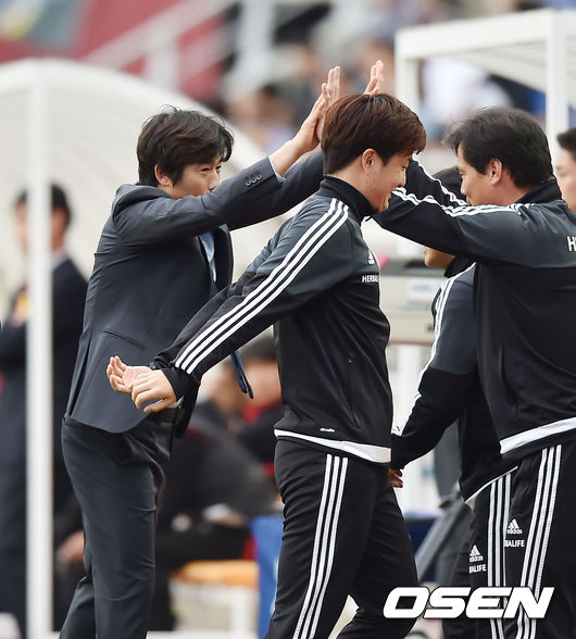 정대세가 다섯번째 골을 성공시키자 수원 서정원 감독이 코치진들과 하이파이브를 하고 있다. / rumi@osen.co.kr