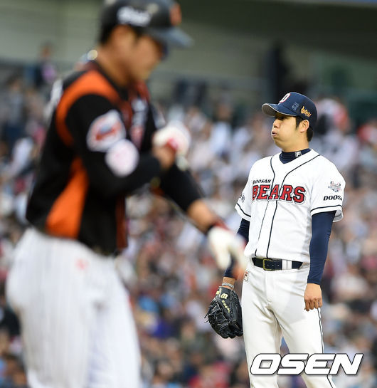 3회초 두산 장원준이 롯데 선두타자로 나선 문규현을 볼넷으로 출루시키며 아쉬워하고 있다.