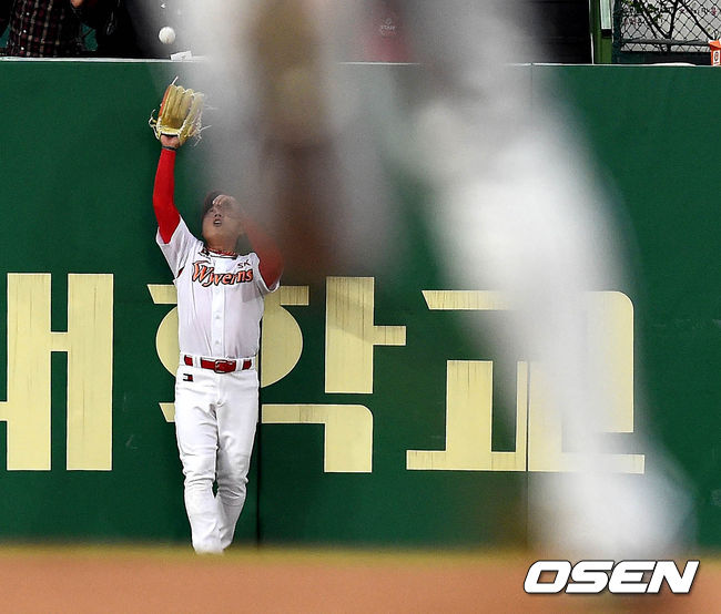 18일 오후 인천SK행복드림구장에서 열린 '2015 타이어뱅크 KBO 리그' SK 와이번스와 LG 트윈스의 경기 4회초 1사 문선재의 뜬공을 박재상이 잡고 있다.