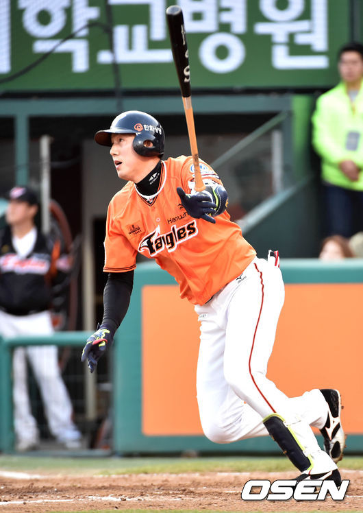 18일 대전 한화생명이글스파크에서 열린 2015 타이어뱅크 KBO리그 한화 이글스와 NC 다이노스의 경기 4회말 무사 김회성이 2루타를 치고 있다.